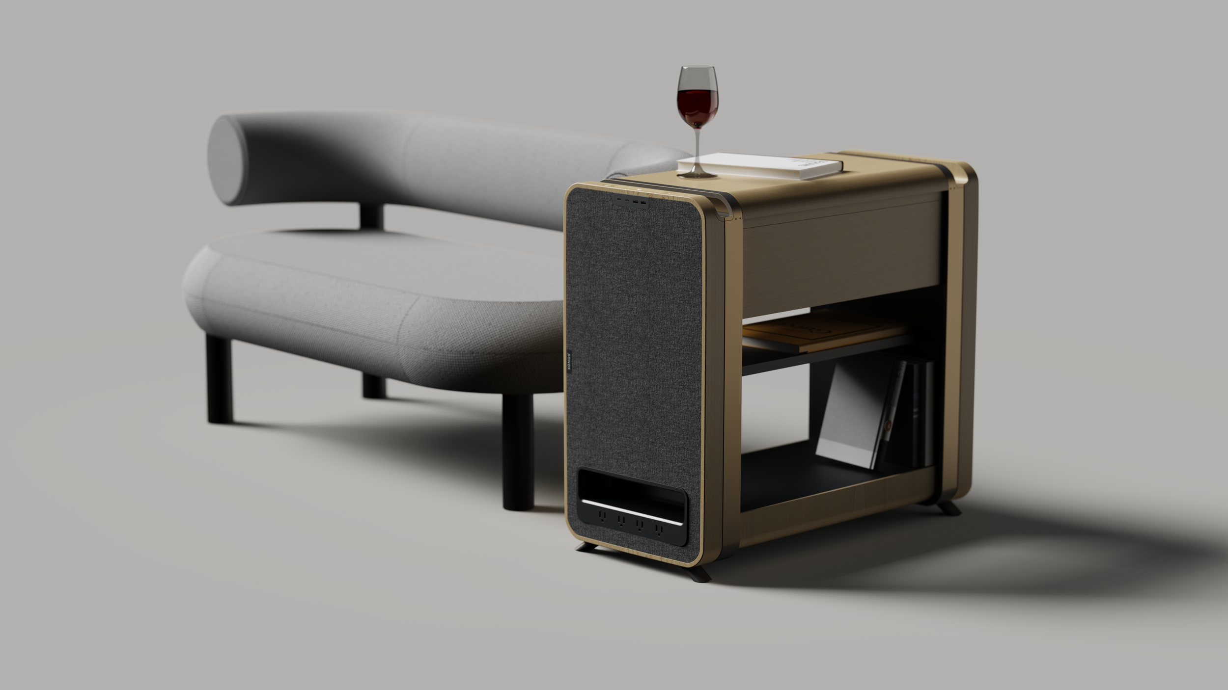 Through regular refinements of the form and mechanisms, the design improved from its distracting forms and became more grounded in simplicity. I decided to integrate SONOS as the audio of the end-table because their form language and DNA fit well with the home entertainment side of the design.